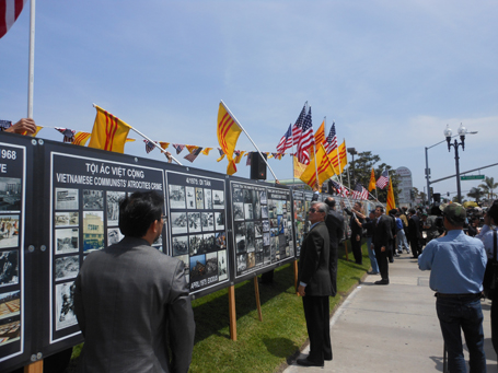 (Vy Trần SGT) - Nằm trong chuỗi sinh hoạt tưởng niệm ngày 30 tháng 4 đen Cộng Đồng Người Việt Quốc Gia Nam California cùng các hội đoàn và đoàn thể đấu tranh các hội đoàn trẻ đã tổ chức một buổi lễ thượng kỳ trên bãi cỏ dọc đường Bolsa bên kia đường trước khu Phước Lộc Thọ vào sáng thứ Bảy vừa qua đồng thời triển lãm bức tường Đen những hình ảnh tội ác của chính quyền Cộng Sản Việt Nam từ năm 1954 cho đến nay cùng những hình ảnh đấu tranh cho một nước Việt Nam Tự Do, Dân Chủ, Nhân Quyền của đồng bào trong nước và hải ngoại, cũng như hình ảnh các Đài tưởng niệm các chiến sĩ và đồng bào đã hy sinh vì Tự Do khắp nơi trên thế giới trong đó có hình ảnh tượng đài chiến sĩ Việt Mỹ và Tượng Đài Thuyền Nhân tại thành phố Westminster. Ban tổ chức đã treo cờ VNCH và Hoa Kỳ dọc theo các con lộ chính quanh khu vực Little Saigon trong suốt 2 tuần lễ tưởng niệm 30 tháng 4.