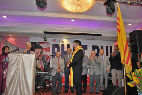 Dân Biểu Tom Deli; Thị Trưởng Garden Grove, Bruce Broadwater; và các Nghị Viên, Kris Beard, Chris Phan; Thị Trưởng Thành Phố Irvine... cùng lên sân khấu, trong lời phát biểu những vị nầy đã ca ngợi về những đóng góp của ông Phát Bùi cho cộng đồng và cư dân trong thành phố từ nhiều năm qua và hứa sẽ ủng hộ ông Phát Bùi trong việc tranh cử kỳ nầy.