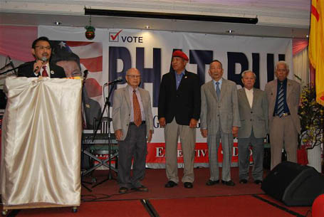 Sau đó mời Hội Đồng Liên Tôn và qúy HT. có mặt lên sân khấu, trong lời phát biểu Giáo Sư Nguyễn Thanh Giàu, Đại Diện Hội Đồng Liên Tôn và HT. Thích Nguyên Trí đã ca ngợi những việc làm cũng như những đóng gop cho cộng đồng của ông Phát Bùi trong thời gian qua nhất là về phương diện đấu tranh cho tự do, dân chủ và nhân quyền tại Việt Nam, chính vì vậy nên những vị nầy hoàn toàn ủng hộ cho ông Phát Bùi trong kỳ tranh cử nầy. Tiếp theo Ban tổ chức mời cựu Đại Tá Lê Khắc Lý, LS. Nguyễn Xuân Nghĩa, Ông Phan Kỳ Nhơn, Cựu Dân Biểu Việt Nam Cộng Hòa Ông Bùi Văn Nhân, Ông Trần Quan An, Ông Phan Tấn Ngưu, Ông Phan Ngọc Lượng... cùng bước lên sân khấu và thay nhau phát biểu, trong lời phát biểu qúy vị nầy đã xác nhận trong thời gian qua ông Phát Bùi đã tham gia vào các sinh hoạt chung của cộng đồng trong mọi lãnh vực nhất là công cuộc đấu tranh cho tự do, dân chủ, chống cộng sản tay sai và Trung Cộng xâm lăng, nơi nào ông cũng tham gia, qua những chuyến đi như Bắc Cali, biểu tình trước tòa Lãnh Sự Trung Quốc và cộng sản. Tham gia biểu tình và điều trần trước Quốc Hội tại Washington DC... Trong lúc làm Chủ Tịch Ủy Ban Kế Hoạch Thành Phố Garden Grove ông đã chứng tỏ trách nhiệm, khả năng và tinh thần phục vụ đối với cư dân trong thành phố. Là một thương gia đã thành công, vì vậy ông muốn đem khả năng của mình để đóng góp một phần nhỏ cho những sinh hoạt chung hiện nay. Nếu được sự tín nhiệm của cư dân trong thành phố để ông tiếp tục con đường phục vụ đó là niềm vui nhất đối với vợ chồng ông.