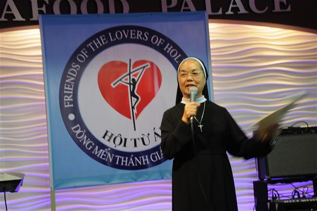 Chương trình khai mạc lúc 6 giờ chiều, sau phần nghi thức, tiếp theo lời chào mừng và cám ơn của nữ tu Agnes Nguyễn Thị Phụng, Tổng Cố Vấn Hội Dòng Mến Thành Giá Cái Mơn. Nữ tu cho biết, Hội Dòng Mến Thành Giá Cái Mơn có 500 nữ tu đang phục vụ tại các tỉnh Bến Tre, Vĩnh Long, Trà Vinh và một phần tỉnh Đồng Tháp. Nhiệm vụ của các nữ tu là lo cho các người già neo đơn, người nghèo khổ và các em mồ côi lang thang đầu đường xó chợ kiếm sống qua ngày. Sơ Tổng Cố Vấn cho biết, sang Mỹ này, Sơ đã thấy rõ, bà con mình rất vất vả, mặc dù cũng muốn giúp Hội Dòng lo việc bác ái xã hội nhưng vì đã có nhiều người sang cầu cứu, làm cho bà con mình cũng đâm ra ngán ngẩm nên Sơ rất lo, không biết đặt nhà hàng rồi mà có người đến ăn hay không. Lúc đầu chị em bên nhà gọi phôn hỏi, Sơ rất lo lắng nói, các chị em lấy chiếc ghe chở nhau sang Mỹ mà ăn tiệc chứ ế rồi, nhưng sau đó, Sơ hết sức vui mừng thấy đông đảo bà con mình đến tham dự, nhiều người đến trao phong bì rồi đi không ăn tiệc làm sơ rất áy náy, rất buồn.