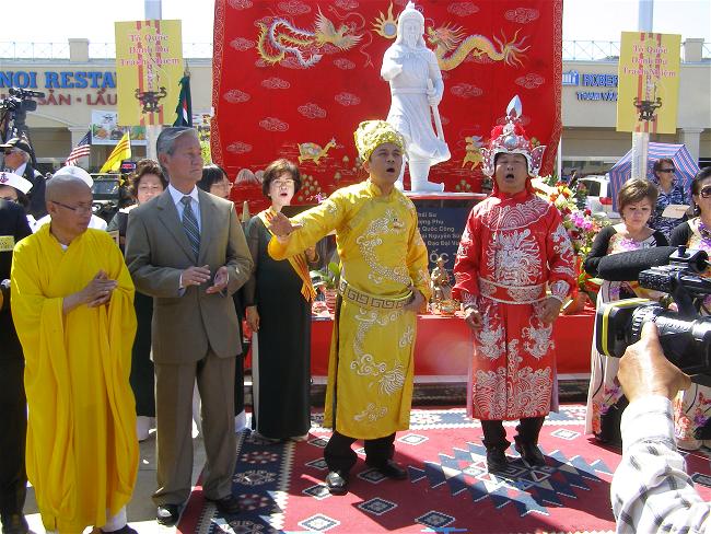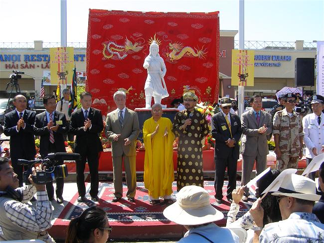 Tiếp theo lời chào mừng của Ủy Ban Dựng Tượng Đài Đức Thành Trần, trong lúc nầy MC đã mời qúy vị trong Ủy Ban Sáng Lập gồm: Hòa Thượng Thích Nguyên Trí, Cựu Đại Tá Cổ Tấn Tinh Châu, Thị Trưởng Tạ Đức Trí, Ông Phan Kỳ Nhơn, Luật Sư Nguyễn Xuân Nghĩa, Ông Nguyễn Ban, Nhà Báo Du Miên, Kỹ Sư Bùi Thế Phát và một số thành viên Ủy Ban lên ngỏ lời chào mừng, cảm ơn sự hiện diện của tất cả đồng hương, trong dịp nầy Thị Trưởng Tạ Đức Trí đã nói: “Thay mặt cho các thành viên xây dựng tượng đài Đức Thánh Trần, chúng tôi rất hãnh diện cùng với đồng hương chứng kiến giây phút mở đầu trang sử mới của cộng đồng người Việt tại Nam California nói chung va Thành Phố Westminster nói riêng. Hôm nay chúng ta có một biểu tượng ngay tại thủ đô của Người Việt Tỵ Nạn Cộng Sản đó là vị Tướng Việt Nam lừng lẫy đã ba lần đẩy lui giặc ngoại xâm phương Bắc, dẹp tan quân Nguyên, Ngài là một vị Thánh, là niềm tin cho toàn thể người Việt trong cũng như ngoài nước để tranh đấu cho tự do, dân chủ.” Tiếp theo LS. Nguyễn Xuân Nghĩa, Chủ Tịch Cộng Đồng Người Việt Quốc Gia Nam California phát biểu: “Chúng tôi xin cảm ơn tất cả những đóng góp của mọi người, Chúng ta noi gương Đức Thánh Tần lãnh đạo đất nước phải lo cho dân thế mà chế độ cộng sản Việt Nam lại hèn với giặc mà ác với dân thì làm sao có tinh thần Hội Nghị Diên Hồng như xưa được... ” Cựu Đại Tá Cổ Tấn Tinh Châu phát biểu: “Chúng ta hãnh diện về Danh Tướng Nhà Trần, tác giả bộ binh thư “Vạn Lý Tập Tông Bí Truyền Thư” Đức Thánh Trần bảo tồn lãnh thổ với những chiến thắng Chương Dương, Bạch Đằng, Vạn Kiếp và làm cho quân Mông Cổ khiếp vía kinh hồn. Ông kêu gọi chúng ta hãy đoàn kết, đó là nguồn lực của sức mạnh...”Sauđó mọi người cùng hô vang những khẩu hiệu: “Toàn Dân Vùng Lên Cứu Nước,” Tự Do Dân Chủ và Nhân Quuyền cho Việt Nam...”