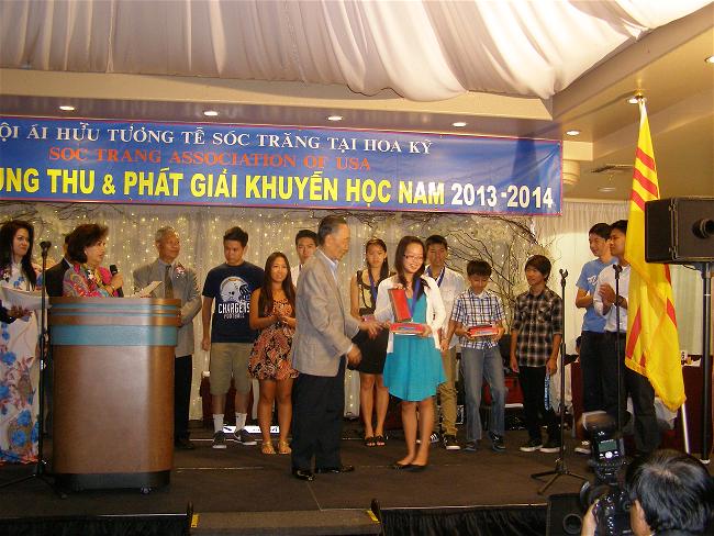Sau đó là phần phát giải khuyến học do Cô Hạnh Ngọc phụ trách, trong lúc nầy cô đã mời các em học sinh xuất sắc trong niên học 2013-2014 lên sân khấu để nhận thưởng, ban tổ chức đã mời một số qúy vị quan khách, qúy vị Giáo Sư và ông Trần Dũ người đã sáng lập Hội Ái Hữu Tương Tế Sóc Trăng lên trao phần thưởng cho các em.