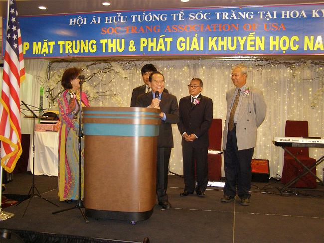 Sau đó nghi thức chào quốc kỳ Việt nam Cộng Hòa, Hoa Kỳ và phút mặc niệm, tiếp theo ông Trần Đình Quang, Phó Hội Trưởng Ngoại Vụ lên ngỏ lời chào mừng và cảm ơn qúy vị quan khách, qúy vị mạnh thường quân cùng toàn thể đồng hương Sóc Trăng tham dự, ông cho biết: “Truyền thống của hội đã trải qua hơn 21 năm tại Miền Nam California đó là vui Tết Trung Thu và phát giải khuyến học cho con em Sóc Trăng có thành tích học hành xuất sắc. Nhân Dạ Tiệc hôm nay thay mặt đồng hương Sóc Trăng tại California cảm ơn các vị mạnh thường quân đã gởi tặng tiền cũng như bánh Trung Thu đến các em Thiếu Nhi Sóc Trăng và ông cũng không quên cảm ơn các Thầy Cô đã bỏ công sức dạy dỗ con em Sóc Trăng trong suốt thời gian qua., ông cũng kêu gọi giới trẻ hãy tích cực tham gia vào công tác của hội.”