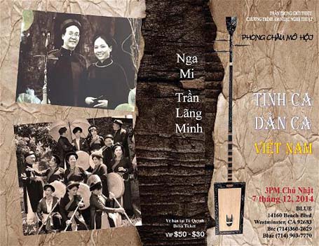 WESTMINSTER - Một buổi nhạc hội Tình Ca & Dân Ca Việt Nam sẽ được cặp nghệ sĩ Nga Mi & Trần Lãng Minh và hàng chục ca nhạc sĩ khác sẽ tổ chức vào Chủ Nhật 7 tháng 12, 2014 tại Westminster, California.