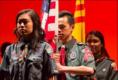 Mở đầu với rước quốc kỳ Việt-Mỹ nghiêm trang do 3 Hướng đạo sinh Connie Thảo Nguyễn, Jesse Tiến Cao và Asley Hanson thuộc Liên Đoàn Hướng Việt và Liên Đoàn Hùng Vương, Nam California thực hiện.(Photo: Raymond Nhựt Nguyễn)