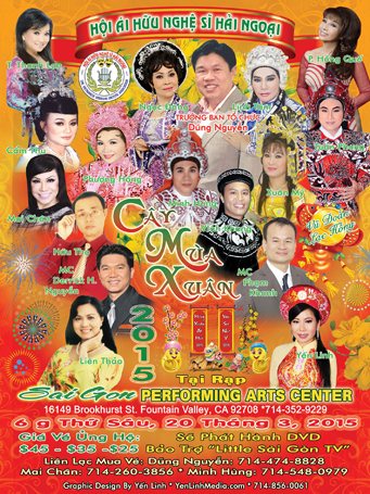 Westminster (Linh Giang) – Hội Ái Hữu Nghệ Sĩ Hải Ngoại tổ chức đêm văn nghệ Cây Mùa Xuân 2015 vào lúc 6 giờ chiều Thứ Sáu ngày 20 tháng 3 năm 2015 tại Sai Gon Performing Arts Center tọa lạc tại số 16149 Brookhurst St. Fountain Valley, CA 92708. Điện thgoại: (714) 352-9229.