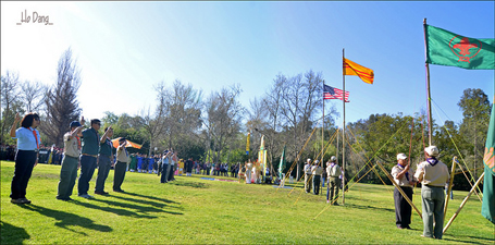 Trưởng Tammy cho biết: “Lễ Chào Cờ Đầu Năm, năm nay phải dời lại một tuần vì lý do thời tiết, tuy nhiên, với châm ngôn “Sắp Sẵn” của Hướng Đạo; mọi phần vụ đã được các Liên Đoàn chuẩn bị sẵn sàng và thực hiện đâu ra đó. Cột cờ do Liên Đoàn Lam Sơn thực hiện, Bàn thờ tổ quốc do Liên Đoàn Văn Lang, Âm thanh do Liên Đoàn Hoa Lư/Trường Sơn/HùngVương, Liên Đoàn Hướng Việt phụ trách tiếp tân và MC, trò chơi kết thân do Liên Đoàn Bạch Đằng Giang, Toán Hầu Kỳ Bế Mạc do Liên Đoàn Chí Linh, phân chia khu vực do Liên Đoàn QuangTrung-NgọcHồi, thức ăn đãi khách do Liên Đoàn Hoàng Sa và Trùng Dương, tiết mục văn nghệ do Liên Đoàn Thăng Long, lều triển lãm do Trưởng Hồ Đăng và các Liên Đoàn đóng góp, v.v. Cũng xin được nhắc lại Lễ Chào Cờ Đầu Năm được tổ chức hàng năm, sau Tết Nguyên Đán vào khoảng cuối tháng 2, đầu tháng 3 nhằm ba mục đích sau:
