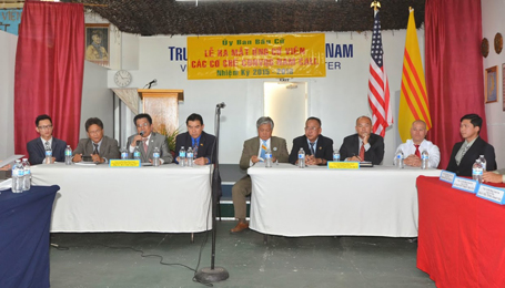 Nghi thức khai mạc do mũ đỏ Vũ Long Sơn Hải phụ trách phần nghi thức chào quốc kỳ Việt Nam Cộng Hòa, Hoa Kỳ và phút mặc niệm, sau đó ông giới thiệu thành phần tham dự. Tiếp theo ông mời Giám Mục Trần Thanh Vân, Trưởng Ban Tổ Chức Bầu Cử; chiến hữu Phan Kỳ Nhơn, Chủ Tịch Liên Ủy Ban Chống Cộng Sản và Tay Sai; ông Phan Tấn Ngưu, Tổng Hội Trưởng Cảnh Sát Quốc Gia; ông Trần Vệ, Hội Trưởng Cựu Sinh Viên Võ Bị Đà Lạt; LS Timothy Trần và bà Thanh Hiền trong ban tổ chức bầu cử vào dãy bàn phía tay trái hội trường. Tiếp theo mời ứng cử viên thuộc hai liên danh Đoàn Kết & Phát Triển và Liên Danh Vì Dân lên ngồi vào dãy bàn trước khán đài, các ứng cử viên Hội Đồng Giám Sát mời vào dãy bàn phía tay phải. Tham dự buổi ra mắt hai liên danh ngoài qúy vị nhân sĩ, qúy vị đại diện các hội đoàn, đoàn thể, qúy cơ quan truyền thông cón nhận thấy có Chủ Tịch Cộng Đồng Người Việt Quốc Gia Tỵ Nạn Cộng Sản, LS. Nguyễn Xuân Nghĩa, Chủ Tịch Cộng Đồng Việt Nam Nam California KS. Ngãi Vinh và Phó Chủ Tịch Nguyễn Kim Bình, hơn 100 đồng hương có mặt trong buổu ra mắt nầy.