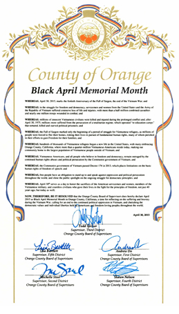 (Santa Ana) Hội Đồng Giám Sát Quận Cam cùng Giám Sát Viên Andrew Đỗ đã xác định Nghị Quyết chọn tháng Tư năm 2015 là Tháng Tưởng Niệm Tháng Tư Đen của quận Cam.