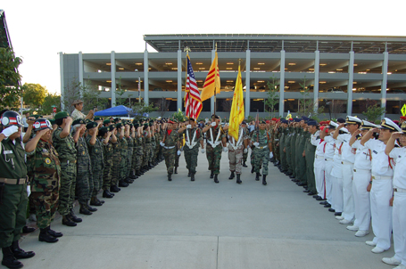 6 giờ 15 Niên trưởng Thiếu Tướng Nguyễn Khắc Bình chủ tọa buổi lễ đến và duyệt hàng quân danh dự