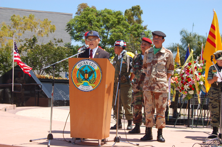 Tối hôm qua chúng ta đã làm lễ truy điệu hàng trăm ngàn chiến sĩ VNCH và đồng minh vì lý tưởng tự do vì bảo vệ lá cờ Vàng 3 sọc đỏ mà phải hy sinh, họ đã nằm xuống cho lá cờ vàng 3 sọc đỏ được tung bay, họ đã làm tròn bổn phận của một người lính là: Tổ Quốc, Danh Dự, Trách Nhiệm, họ đã chiến đấu anh dũng để cho chúng ta có được ngày hôm nay. Chúng ta phải thấy món nợ đó của chúng ta với những người đã nằm xuống, chúng ta phải đứng chung lại với nhau cùng nhau bảo vệ đất nước. Ông tiếp chúng ta rất hãnh diện với thế hệ trẻ, con em người Việt chúng ta đã làm rạng danh người Việt trên tất cả mọi lãnh vực trên quê hương thứ 2 này, như một chuẩn tướng quân đội Hoa Kỳ tướng Lương Xuân Việt, thị trưởng 2 thành phố Westminster, Garden Grove, khoa học gia Dương Nguyệt Ánh, thượng nghị sĩ tiểu bang Janet Nguyễn, giám sát viên quận Orange Andrew Đỗ .... nhiều và rất nhiều nữa.
