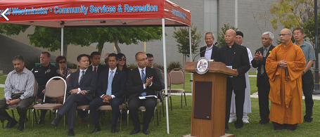Westminster (Vân Giang) - Tại Sid Goldstein Freedom Park (Tượng Đài Chiến Sĩ Việt Mỹ) Hội Đồng Thành Phố Westminster đã tổ chức lễ trồng cây tại Sid Goldstein Freedom Park để vinh danh Đức Đạt Lai Lạt Ma Đời Thứ 14 nhân chuyến viếng thăm của Ngài tại Miền Nam California, đồng thời cũng để mừng sinh nhật lần Thứ 80 của Ngài.