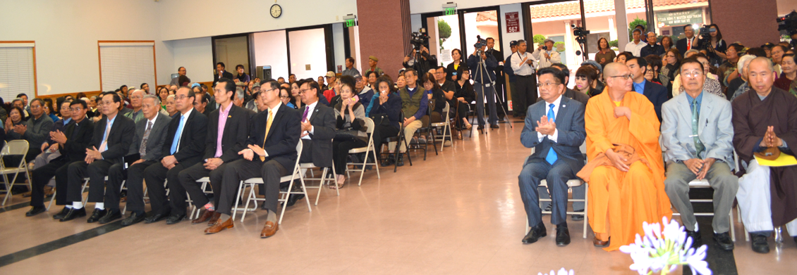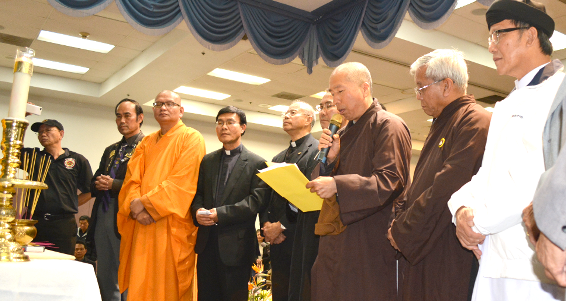 Sau đó Hòa Thượng Thích Minh Nguyện, Chủ Tịch Hội Đồng Liên Tôn VN lên chào mừng quan khách và đồng hương, HT. tiếp “Chúng ta cùng tụ họp nơi đây để cầu nguyện cho đồng bào trong nước, trước thảm họa hủy diệt môi sinh xảy ra vào ngày 6 Tháng Tư tại miền Trung Việt Nam. Đồng bào sinh sống bằng nghề bắt cá, tôm, đã và đang bị thiệt hại bởi chất độc hại do nhà máy Formosa thải ra. Thay vì bảo vệ người dân, CSVN đánh đập người biểu tình, kể cả phụ nữ và trẻ em. Chúng ta phải lên tiếng ủng hộ cuộc tranh đấu của đồng bào. Họ đã vượt qua sự sợ hãi, đứng lên đáp lời sông núi. Ngày quang phục quê hương đã đến,"