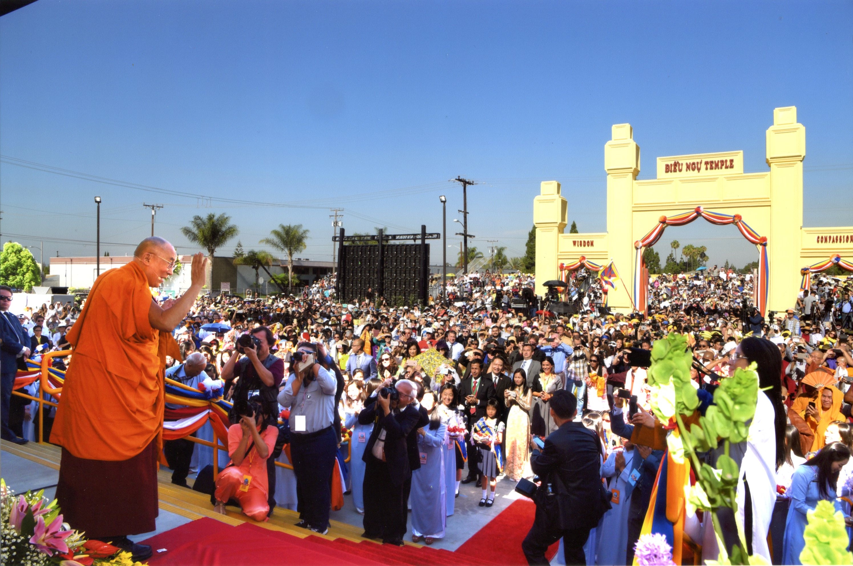 (Thái Trần SGT) - Một hiện tượng đầy phước báu vô lượng vừa xảy ra tại trung tâm Thủ Đô Tinh Thần của người Việt tỵ nạn Little Saigon khi Hòa Thượng Thích Viên Lý Chủ Tịch Hội Đồng Điều Hành Tăng Đoàn Giáo Hội Phật Giáo Việt Nam Thống Nhất Hải Ngoại, Viện Chủ Chùa Điều Ngự cung thỉnh Đức Đạt Lai Lạt Ma đời thứ 14 đến thuyết pháp và cắt băng khánh thành Chùa Điều Ngự ở địa chỉ 14472 Chestnut St, Westminster, CA 92683. Mặc dù thời tiết nắng gay gắt sau 10 giờ sáng Thứ Bảy ngày 18 tháng 6 năm 2016 và Chủ Nhật 19 tháng 6 năm 2016 nhưng không làm nản lòng có đến hàng chục ngàn người gồm các sắc dân Mỹ, Đài Loan, Nhật Bản, Đại Hàn, Thái Lan, Tây Tạng, Việt Nam, Miến Điện, Tích Lan... đã sắp hàng từ 5 giờ sáng và trải qua trạm kiểm soát chặt chẽ của những người an ninh thuộc chính phủ Hoa Kỳ và sự phụ giúp của sinh viên thanh niên Phật Tử để được lắng nghe Ngài thuyết pháp bằng tiếng Tây Tạng và chuyển dịch qua tiếng Việt của Ni Sư Nhật Hạnh đã tu học tại Dharamsala hơn 10 năm và để được nhìn Ngài như một biểu tượng cao quý hiện thân của Từ Bi và Trí Tuệ. Không những Cộng Đồng Việt Nam mà các cộng đồng khác trên thế giới cũng ước mơ được gặp Ngài. Hôm nay đánh dấu ngày lịch sử duyên lành đến với Thành Phố Westminster đến với mọi người Việt chúng ta được vinh dự nghinh đón Ngài.