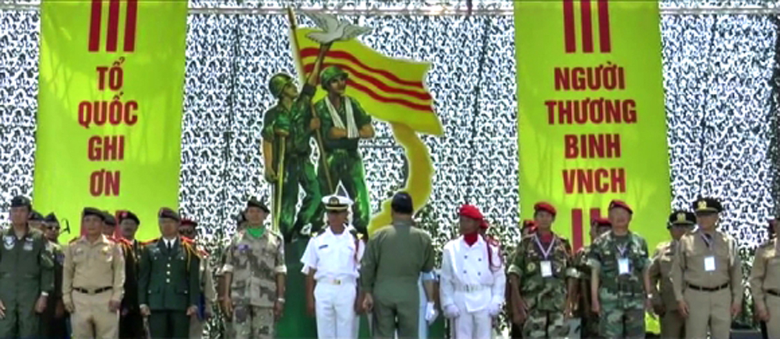 Chủ tịch Liên Hội Cựu Chiến Sĩ VNCH Nam California phát biêủ: .. Quý vị thử nghĩ một anh chiến binh mù 2 mắt, một anh chiến binh cụt 2 chân đang dìu nhau trên đường phố để kiếm sống thì thử hỏi quý vị, có cái thương cảm nào bằng cái thương cảm này. Nếu ngày trước Đồng Minh chúng ta không phản bội chúng ta thì ngày hôm nay chúng ta không có Đại Nhạc Hội như thế này