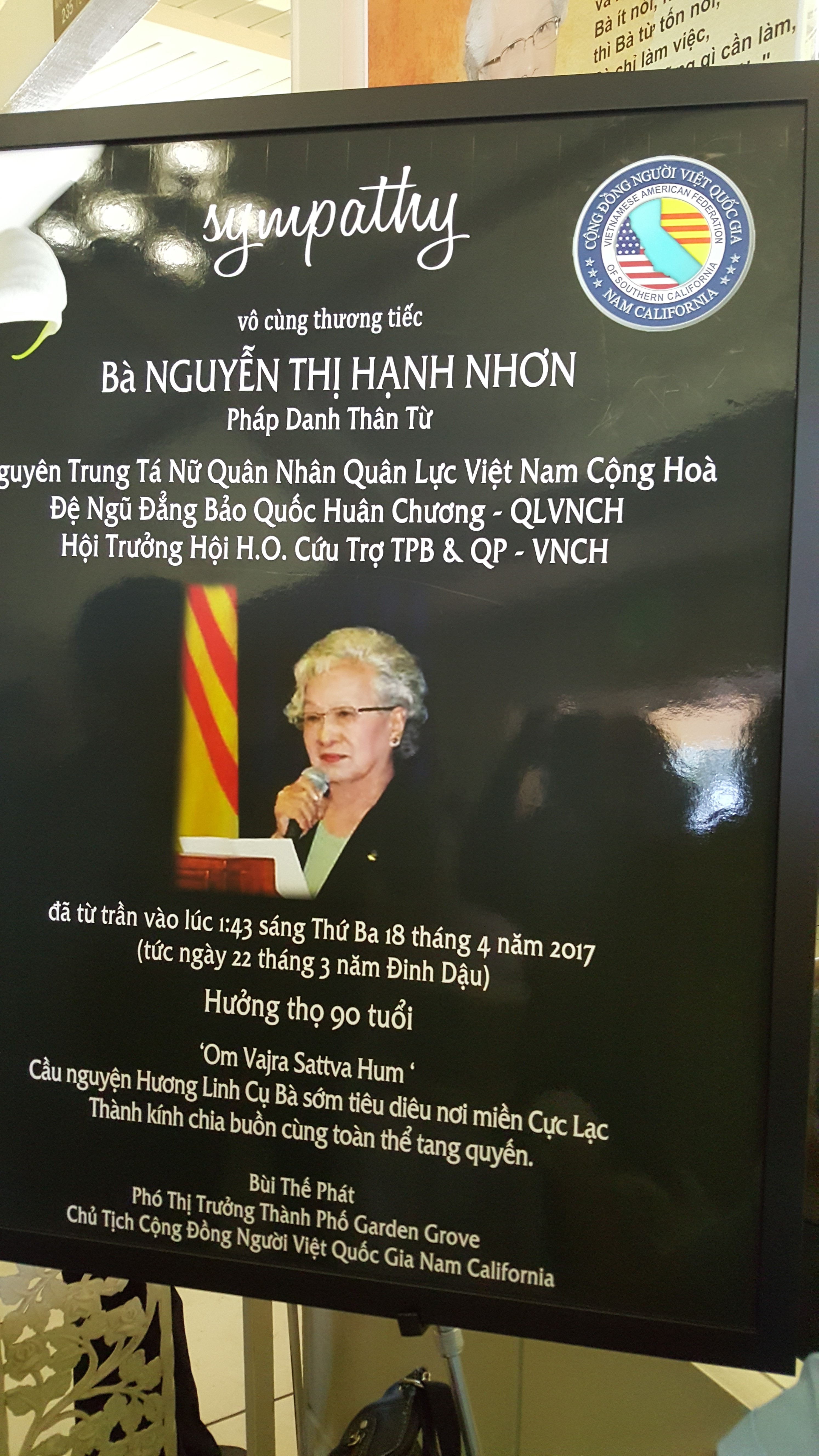 (Vy Trần SGT) - Bà Nguyễn Thị Hạnh Nhơn Trung Tá QLVNCH con chim đầu đàn của Hội H.O Cứu Trợ Thương Phế Binh và Quả Phụ VNCH đã từ giã con cháu, bạn bè những thương binh, quả phụ VNCH cùng các chiến hữu ra đi vào lúc 1 giờ 43 phút sáng thứ Ba ngày 18 tháng Tư năm 2017 tại bệnh viện Fountain Valley hưởng thọ 91 tuổi.