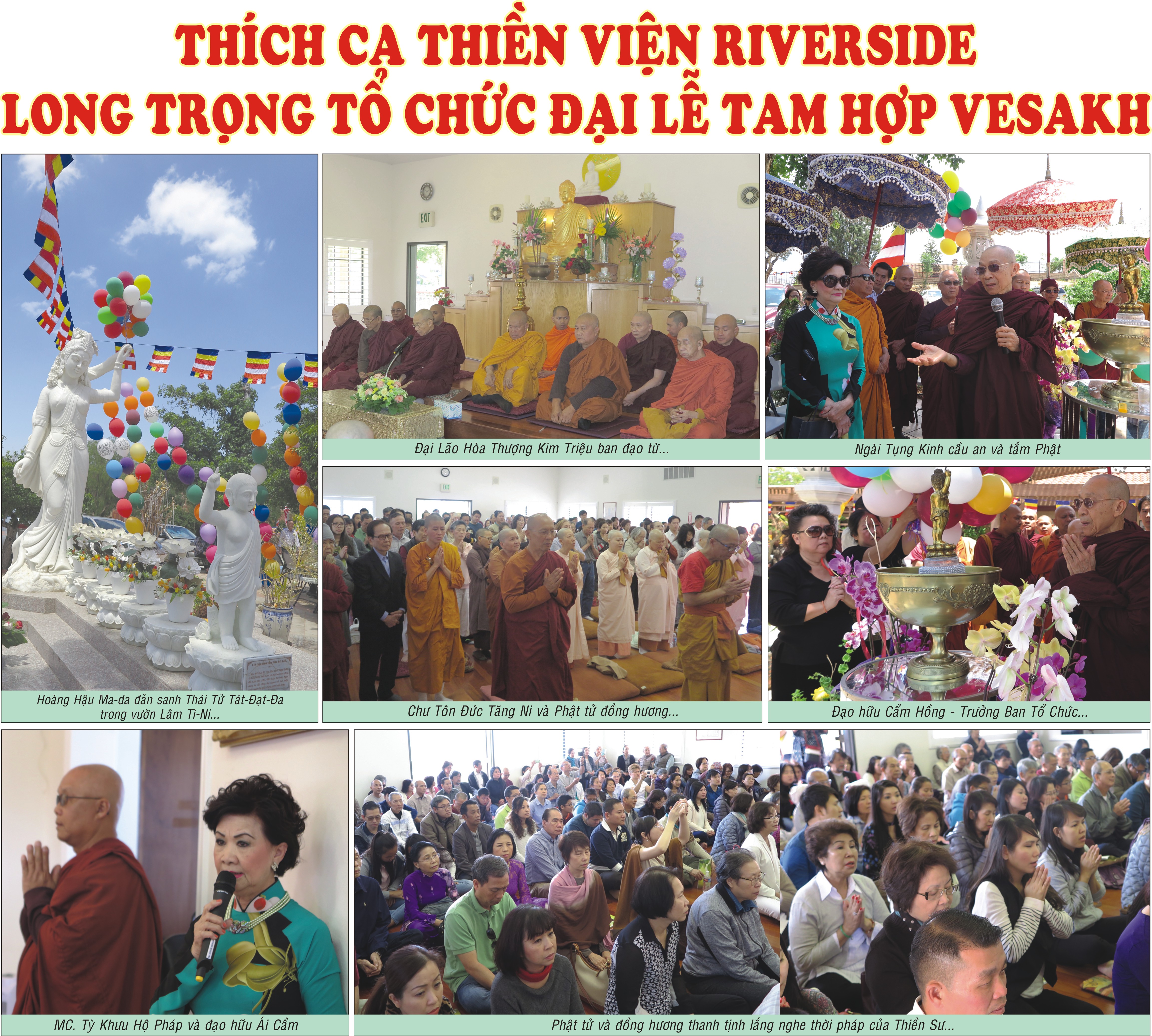 Riverside (SGT) Theo truyền thống Phật Giáo Nguyên Thủy hàng năm, vào ngày rằm tháng Tư Âm Lịch được gọi là Đại Lễ Tam Hợp đánh dấu ba sự kiện trọng đại của lịch sử nhân loại: Ngày Đức Bồ Tát Đản Sanh, Đức Phật Thành Đạo và Đức Phật Nhập Niết Bàn. Hằng năm các Tự Viện, Chùa chiền đều có tổ chức Ngày Đại Lễ Tam Hợp Vesakh vô cùng trọng đại trên khắp thế giới. Năm nay tại Thích Ca Thiền Viện Riverside đã long trọng tổ chức Đại Lễ Vesakh Phật Lịch 2561 vào ngày Chủ nhật 15-5-2017 tại khuôn viên Thích Ca Thiền Viện địa điểm 15950 Winters Lane, Riverside, CA 92504. Buổi lễ chính thức diễn ra từ lúc 9 giờ 30 sáng với sự quang lâm của đông đảo Chư Tăng và đồng hương Phật tử tham dự. Về phía Chư Tôn Đức Giáo Phẩm Tăng Ni chúng tôi ghi nhận có Đại Lão Hòa Thượng Thiền Sư Khippapanno Kim Triệu Viện Chủ Kỳ Viện Tự ở Washington D.C. và Thích Ca Thiền Viện Riverside California; Tỳ Khưu Dhammapanno - Pháp Trí; Tỳ Khưu Dhammasaro - Pháp Chất (VN); Tỳ Khưu Agasami - Khánh Hỷ (Ananda); Tỳ Khưu Visudhipunno - Phước Tịnh (VN); Tỳ Khưu Pannapajjoto - Huệ Quang (TCTV); Tỳ Khưu Dhammapalo - Hộ Pháp (TCTV); Tỳ Khưu Thanakamo - Thiện Nghiệp (TCTV); Tỳ Khưu Pannadhammika - Pháp Tuệ (TCTV); Tỳ Khưu Jotika - Thiện Đăng (Ananda); Bhikkhu Sangha Tăng (Cambodia Temple); Bhikkhu Kontaseylo Tanna (Cambodia Temple); Bhikkhu Chandarathana (Sambuddhaloka Buddhist).