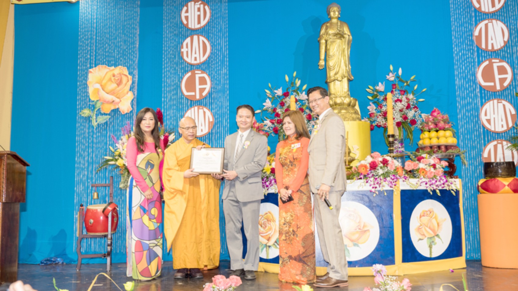 Quý vị dân cử phát biểu: Thị Trưởng Tạ Đức Trí tặng Bản Vinh Danh đến HT. Thích Viên Lý