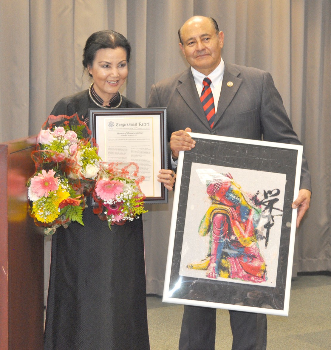 Dân Biểu Lou Correa trịnh trọng tuyên bố rằng, hôm nay là một ngày trọng đại để công nhận sự đóng góp trọn đời cho nền điện ảnh và cộng đồng, cũng như để kỷ niệm 60 năm điện ảnh của nữ tài tử Kiều Chinh. Ông nói nữ tài tử Kiều Chinh đã đóng góp rất nhiều cho cộng đồng người Việt và cộng đồng người Mỹ. Ông cho biết Quốc Hội Hoa Kỳ đã ghi vào biên bản thông điệp và những đóng góp của nữ tài tử Kiều Chinh cho nền điện ảnh và cho cộng đồng.