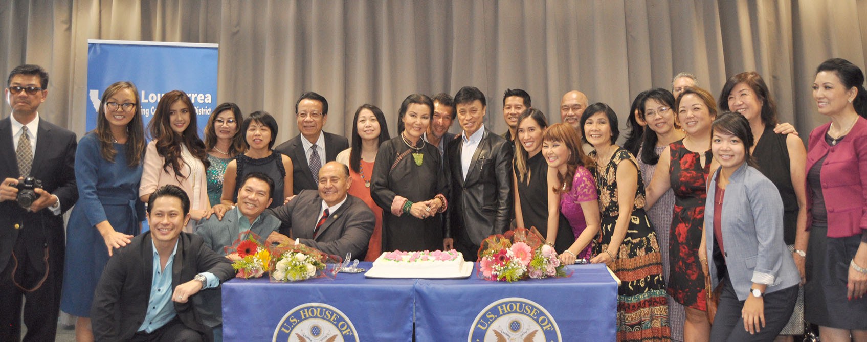Dân Biểu Lou Correa và nữ tài tử Kiều Chinh cũng đã cùng mọi người chụp hình lưu niệm và cắt bánh ăn mừng kỷ niệm 60 năm điện ảnh Kiều Chinh.