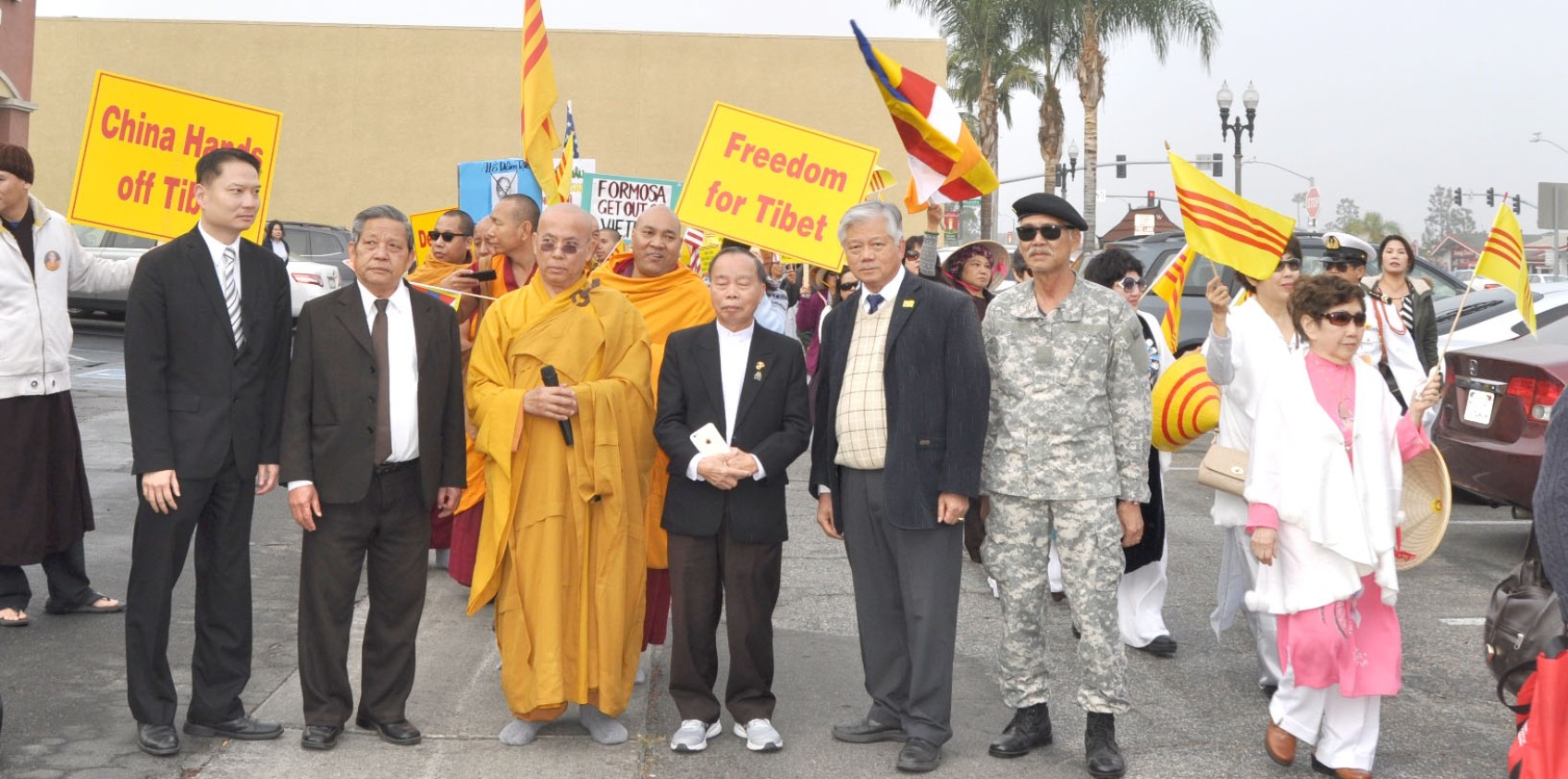 Westminster (Vân Giang) - Tại tượng đài Đức Thánh Trần vào lúc 10 giờ sáng Chủ Nhật ngày 31 tháng 12 năm 2017, hệ thống Chùa Tầm Nguyên tại Thành Phố Indio, Nam California do Thượng Tọa Thích Thông Lai hướng dẫn hàng trăm Chư tôn Đức Tăng, Ni trong đó có 4 vị Tăng Tây Tạng và rất đông đồng hương Phật tử đã rầm rộ xuống đường tuần hành để yểm trợ đồng bào quốc nội chống chính quyền cộng sản đòi tự do tôn giáo, tự do, dân chủ, nhân quyền được tôn trọng, lãnh thổ lãnh hải được vẹn toàn. Trước khi đoàn người phát xuất cuộc diễn hành, lễ chào quốc kỳ tại đền Đức Thánh Trần đã diễn ra long trọng với sự hiện diện của ông Thị Trưởng Tạ Đức Trí, Linh Mục Nguyên Thanh, Nhà Biên Khảo Phạm Trần Anh, qúy vị trong Hội Đồng Quản Trị Đền Đức Thánh Trần có ông Phan Tấn Ngựu, ông Lê Quang Dật, ông Hứa Trung Lập…một số qúy vị đại diện hội đoàn, đoàn thể, các cơ quan truyền thông.