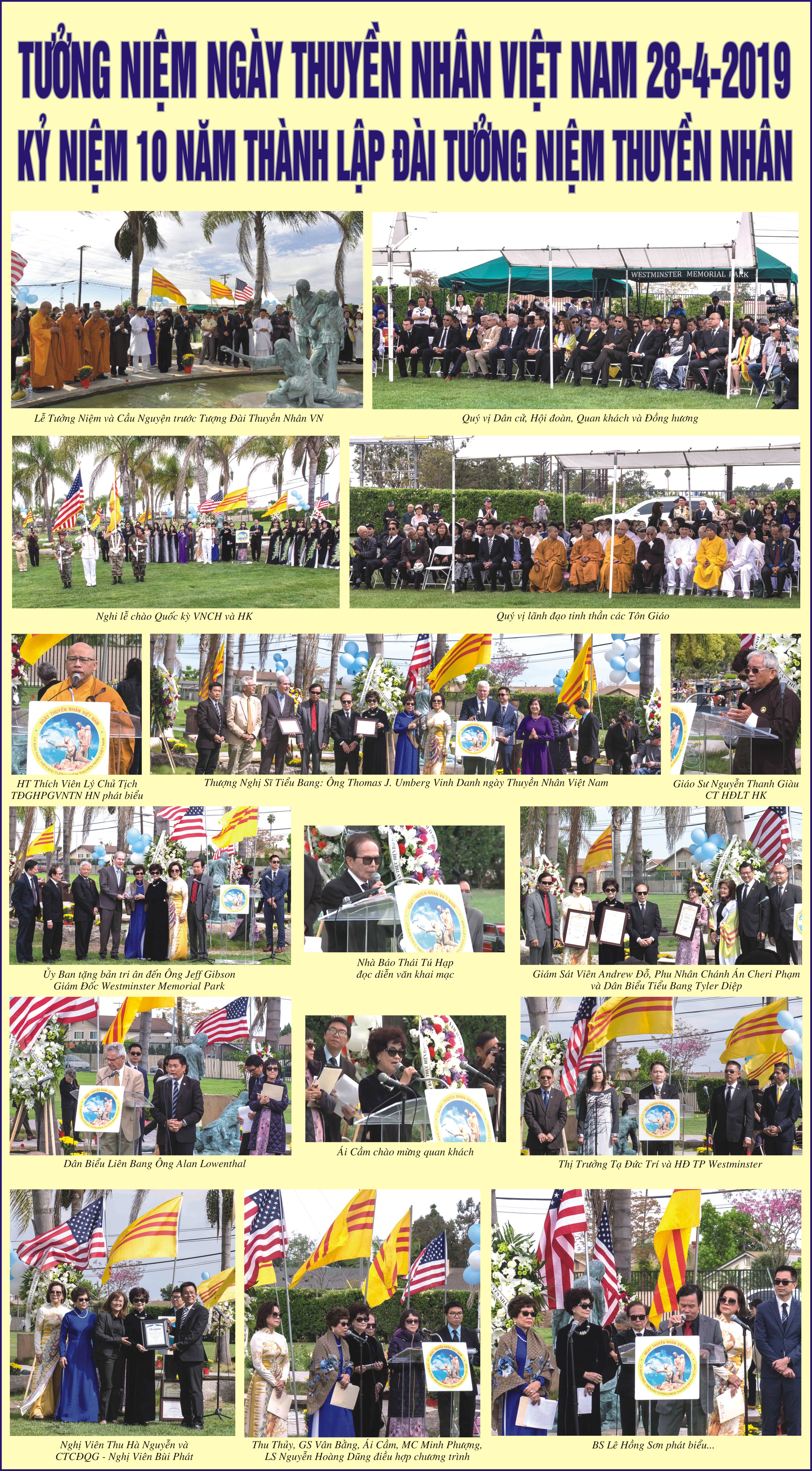 Westminster -Hằng năm vào những ngày cuối tháng Tư, cùng với chuỗi sinh hoạt Tưởng Niệm ngày Quốc Hận 30 tháng 4, Ủy Ban Thực Hiện Đài Tưởng Niệm Thuyền Nhân, Bộ Nhân Việt Nam đã long trọng tổ chức Lễ Tưởng Niệm. Lễ tưởng niệm lần Thứ 10 tại Tượng Đài Thuyền Nhân số 7801 Bolsa Ave., Westminster, CA 92683 trong khu Nghĩa Trang Westminster Memorial Park, buổi lễ diễn ra vào lúc 1:30 chiều Chủ Nhật ngày 28 tháng 4 năm 2019.