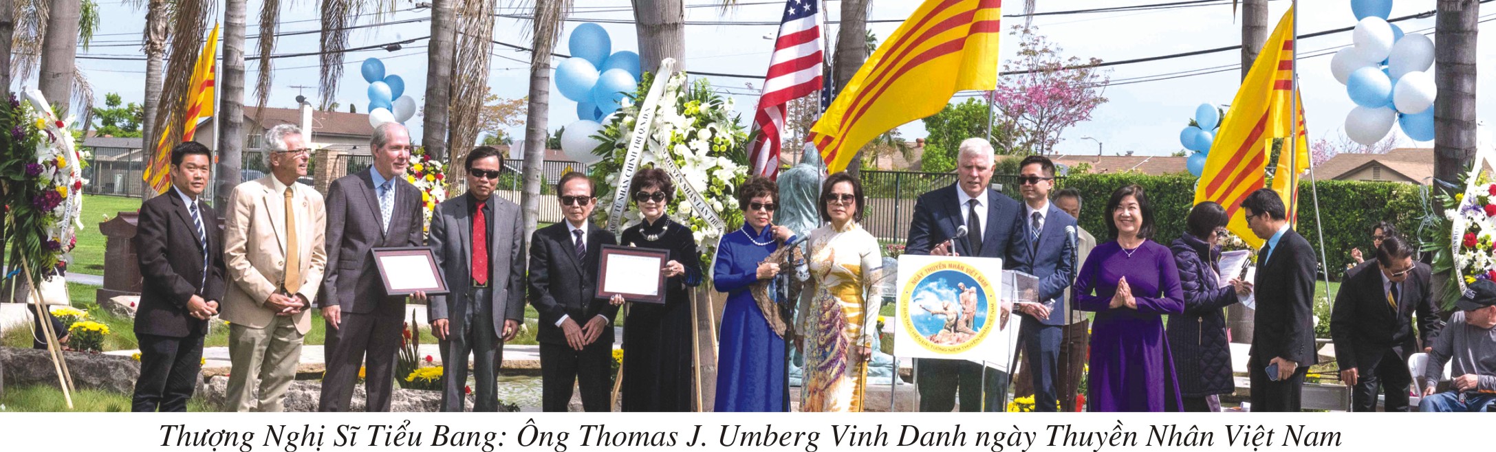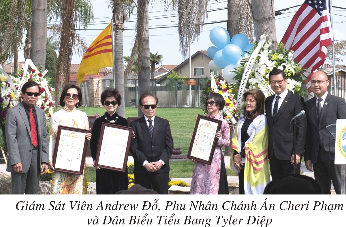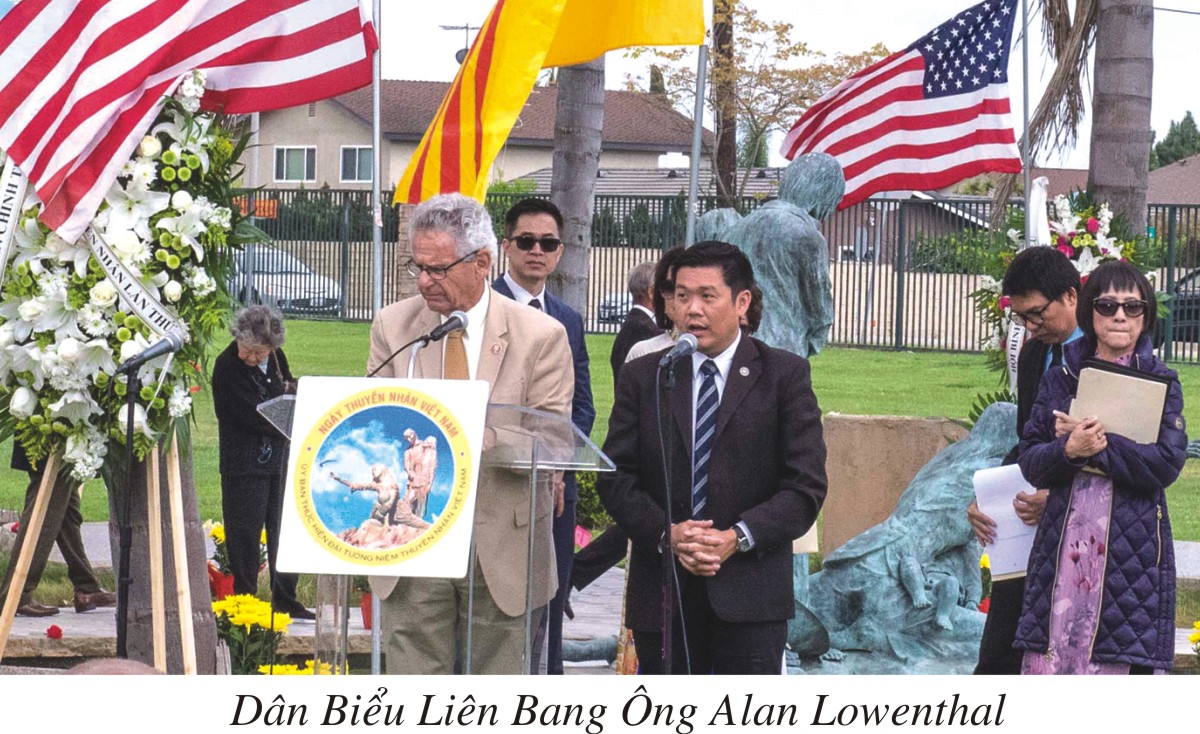 Tiếp theo ban tổ chức mời Dân Biểu Tyler Diệp, Giám Sát Viên Andrew Đỗ và phu nhân là Bà Chánh Án Chieri Phạm, Trong lời phát biểu những vị nầy đã cảm ơn Ủy Ban Xây Dựng Tượng Đài đã làm một việc đầy ý nghĩa để lại cho các thế hệ mai sau biết, Đề cập đến quê hương ông Giám Sát Viên cũng đã nói về những sự băng hoại của nền đạo đức và ông cũng nhấn mạnh đến những tay sai tiếp tay với cộng sản để gây chia rẽ cộng đồng làm lợi cho cộng sản. Như mọi người đều biết trong những ngày gần đây GSV Andrew Đỗ cũng đa tiến hành việc thành lập một nghĩa trang cho quân, dân cán chính VNCH đó là niềm vui chung cho cộng đồng người Việt tỵ nạn cộng sản tại Nam California. Sau lời phát biểu GSV Andrew Đỗ, Dân Biểu Tyler Diệp cũng đã trao bằng tưởng lê đến Ủy Ban Xây Dựng Tượng Đài. Sau đó Ban tổ chức mời qu1y vị dân cử lên phát biểu và trao bằng tưởng lệ đến ủy ban xây dựng tượng đài, trong lúc nầy Thượng Nghị Sĩ Tom Umberg cũng đã trao bản quyết nghị của Thượng Viện Tiểu Bang để công nhận ngày Thuyền Nhân Việt Nam.