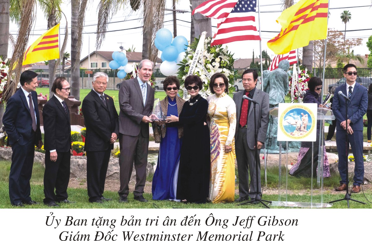 Tất cả đều do Nhân Duyên chúng ta nên tri ân nghĩa cử nhân ái vô cùng cao quý đã tận tình giúp đỡ của ông Jeff Gibson và Ban Giám Đốc Westminster Memorial Park. Đặc biệt kỷ niệm 10 năm thành lập Đài Tưởng Niệm Thuyền Nhân. Ông Jeff Gibson chấp thuận cho Ủy Ban dựng thêm những tấm bia đá sẽ khắc gần 1000 phương danh mà quý thân nhân đã tiếp tục gởi về sau ngày khánh thành vào vị trí chung quanh Tượng Đài mà quý vị đã nhìn thấy. Đây là lần cuối cùng chấm dứt về việc nhận phương danh Thuyền Nhân-Bộ Nhân…”