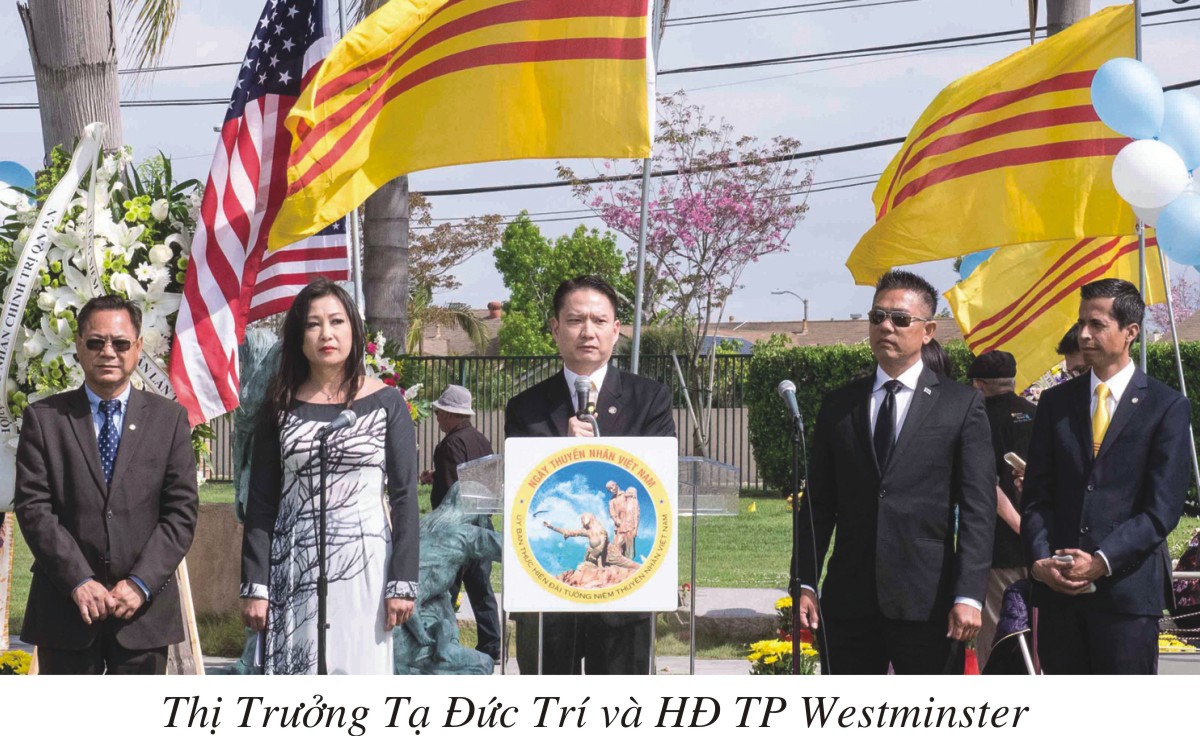 Tiếp theo phần phát biểu của Thị Trưởng Tạ Đức Trí và các Nghị Viên trong Hội Đồng Thành Phố, tất cả đều ca ngợi việc làm đầy ý nghĩa và hứa sẽ tiếp tục hổ trợ cho Ủy Ban, sau đó trao bằng tưởng lệ của Thành Phố đến Ủy Ban Xây Dựng Tượng Đài.