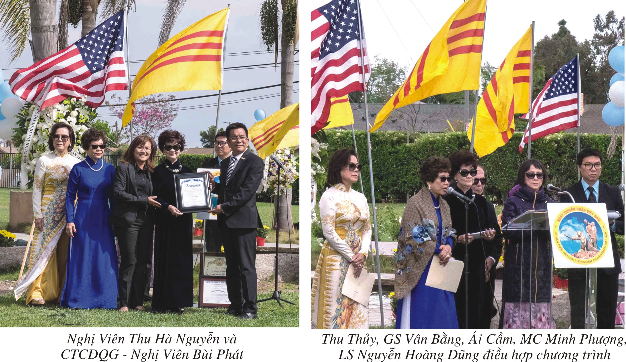 Tiếp tục với phần phát biểu của Nghị Viên Phát Bùi, Chủ Tịch Cộng Đồng Người Việt Quốc Gia Nam Cali va Nghị Viên Thu Hà Nguyễn, trong lời phát biểu là một người trẻ, Nghi Viên Thu Hà xin cảm ơn các Bác, các Chú đã làm một việc đầy ý nghĩa để các cháu hiểu thêm về biến cố Tháng Tư. Nghị Viên Phát Bùi cũng đã cảm ơn Ủy Ban Xây Dựng Tượng Đài, nhân dịp nầy ông cũng đã thông báo về dự án xây dựng tượng Đài Tưởng Niệm Quân Dân Cán Chính Việt Nam Cộng Hòa tại Garden Grove Park, rong dịp nầy ông cũng mong được sự hổ trợ của Giám sát Viên Andrew Đỗ. Sau đó cô Thu Hà và Ông Phát Bùi đã trao bằng tưởng lệ đến Ủy Ban để ghi nhận những đóng góp giá trị trong cộng đồng người Việt tỵ nạn cộng sản.