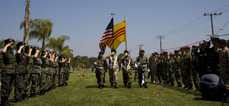 Toán rước Quốc Kỳ Hoa Kỳ - Việt Nam Cộng Hòa do Hội Cựu Chiến Sĩ QL/VNCH đang tiến vào vị trí hành lễ (Hình Trương Tuấn)