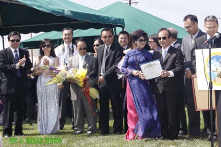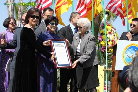 Bà Margie Rice, Thị Trưởng Westminster, trao tặng bằng khen. Thay mặt Ủy Ban, Bà Ái Cầm và Thu Thủy nhận. (Hình Thanh Niên Cờ Vàng)