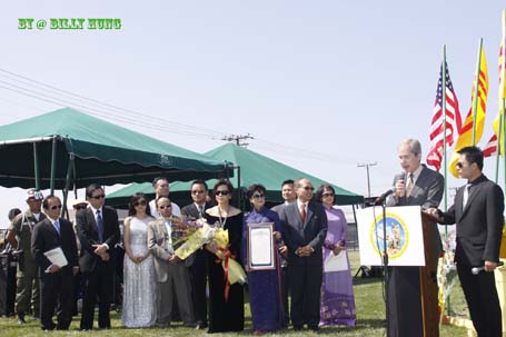 Thị trưởng Westminster, bà Margie Rice, nghị viên Tạ Đức Trí, Nghị viên Diệp Miêng Trường được ban tổ chức mời phát biểu cảm tưởng, bà Rice nói: “cá nhân tôi và các Nghị viên Hội Đồng Thành Phố rất thán phục những người Việt Nam can đảm đã dùng thuyền vượt biển tìm tự do sau ngày CSVN đánh chiếm Saigon và những Thuyền Nhân sống sót đã làm một việc có nhiều ý nghĩa cao đẹp đối với những người không may mắn nằm lại dưới lòng biển sâu trong các cuộc hành trình đầy hiểm nguy của họ. Hôm nay Kỷ niệm một năm “Ngày Thuyền Nhân Việt Nam” tại Westminster Hội Đồng Thành Phố muốn trao tặng Ủy Ban Thực Hiện Đài Tưởng Niệm Thuyền Nhân Việt Nam quyết định “Vinh Danh và Khen Thưởng các thành viên trong Ủy Ban về hoạt động mang tính cách Nhân Đạo, Lịch Sử của Ủy Ban đối với Dân Tộc, Cộng Đồng và những Thuyền nhân không may mắn đã bỏ mình trên đường tìm Tự Do...”. Nghị viên Tạ Đức Trí đã trao tặng Ủy Ban Bằng Khen Thưởng trước sự hiện diện của Chánh án Nguyễn Trọng Nho, ông bà Thái Tú Hạp, Ái Cầm, Bác Sĩ Lê Hồng Sơn và bà Thu Thủy, BS Ngô Phùng Hỷ, Minh Phượng, Doanh Doanh, Luật Sư Từ Huy Hoàng, Tăng Khánh Hiền – Hạnh Nhi. Chánh Án Nguyễn Trọng Nho thay mặt Ủy Ban TH/ĐTNTNVN ngỏ lời cảm ơn bà Thị trưởng, các Nghị viên đã dành nhiều ưu ái đối với UB/THĐTNTNVN và Cộng Đồng Việt Nam tại thành phố Westminster. Trong dịp này Ủy Ban đã tặng hoa cho Bà Thị Trưởng Margie Rice, hai Nghị viên Tạ Đức Trí, Diệp Miêng Trường với những lời tri ân sâu xa của Ủy Ban TH/ĐTNTNVN. Trong dịp này Đại Diện Dân Biểu Liên Bang Loretta Sanchez, Dân biểu Tiểu Bang Trần Thái Văn và Đại diện Giám Sát Viên Janet Nguyễn đã trao tặng bằng Tưởng lục cho Ủy Ban Thực Hiện Đài Tưởng Niệm Thuyền Nhân Việt Nam. Một vài tiết mục văn nghệ phụ diễn của Ban Tù Ca Xuân Điềm và Ca Đoàn Áo Xanh của DS. Nguyễn Đức Năng đã tạo nên những hào khí thiêng liêng của tiền nhân dựng nước và giữ nước, đến những oan nghiệt những Thuyền Nhân tử nạn vì Tự Do trên Biển Đông.