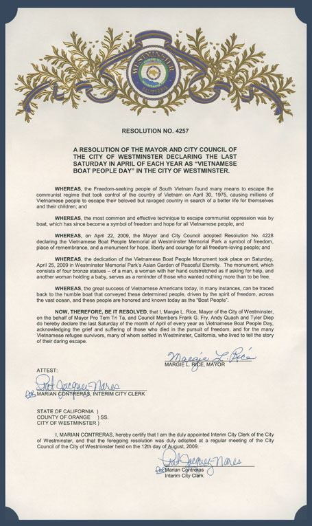 XÉT RẰNG, vào ngày 22 tháng Tư năm 2009, Thị Trưởng và các Nghị Viên Thành Phố đã công nhận Nghị Quyết 4228 tuyên bố Tượng Đài Thuyền Nhân Việt Nam tại Westminster Memorial Park là biểu tượng của tự do, một nơi để tưởng nhớ, và là tượng đài của hy vọng, tự do và sự can trường cho tất cả những người yêu tự do; và