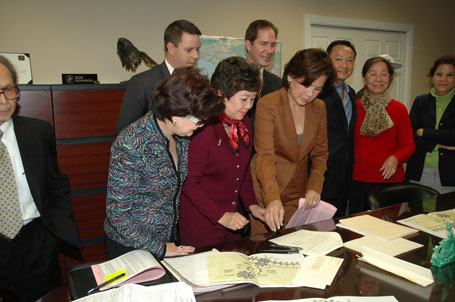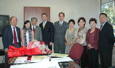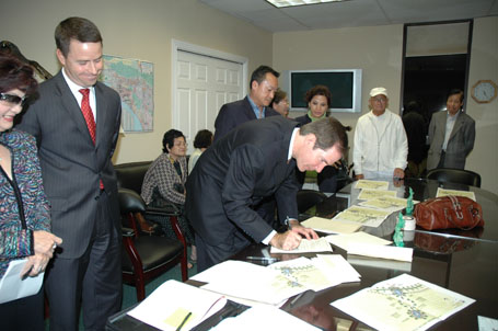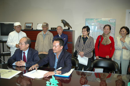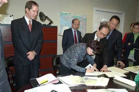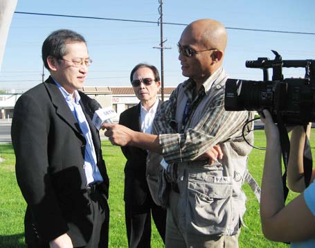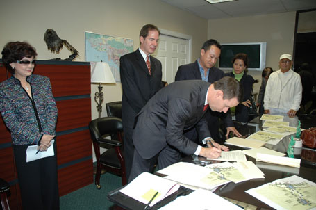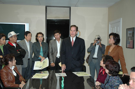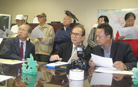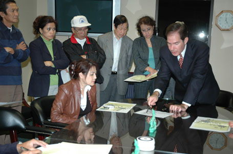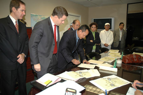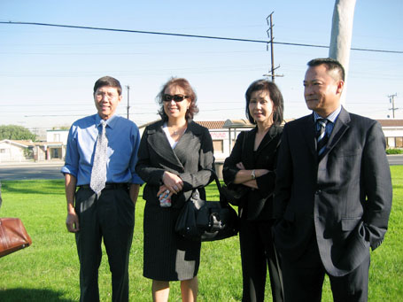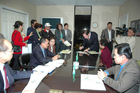 (Từ phải) Luật Sư Từ Huy Hoàng - Nhà Báo Thái Tú Hạp - đang thảo luận Bản Hợp Đồng ký với Ban Giám Đốc Westminster Memorial Park vào ngày 21-11-2007, trước sự chứng kiến của Chánh Án Nguyễn Trọng Nho và sự tham dự của Ban Chấp Hành Hội Y Sĩ Nam Cali và Ban Trị Sự Đại Đạo Tam Kỳ Phổ Độ
