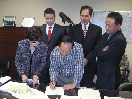 Trong thời gian qua, trước khi đi đến quyết định ký hợp đồng, Ủy Ban Thực Hiện Đài Tưởng Niệm Thuyền Nhân đã nhiều lần đến thảo luận với Ban Giám Đốc Westminster Memorial Park. Lần gặp thứ 5 gồm có (từ bên phải): LS Từ Huy Hoàng, Ái Cầm, Thu Thủy, Vân Bằng, ông Jeff Gibson, ông Chris Wendel, Hứa Trung Lập, Thái Doanh Doanh và sự chứng kiến của Chánh Án Nguyễn Trọng Nho.
