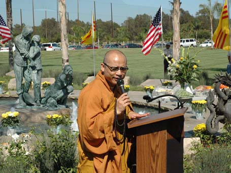 Thượng Tọa Thích Viên Lý, Tổng Thư Ký Văn Phòng II Việt Hóa Đạo GH/PGVNTN Hải Ngoại trong lời phát biểu đã nhấn mạnh đến tính kiên trì chịu đựng của các thành viên trong Ủy Ban Thực Hiện Đài Tưởng Niệm Thuyền Nhân Việt Nam hơn 10 năm trải qua những khó khăn vất vả để có được ngày hôm nay Tượng Đài đã hoàn thành và hôm nay là buổi lễ cầu siêu đầu tiên cho các nạn nhân đã tử nạn trên đường vượt biển tìm Tự do. Thượng tọa Thích Viên Lý trong dịp nầy cũng đề cập đến thực trạng hiện nay tại Việt Nam, chế độ mỗi ngày càng gia tăng đàn áp không những đối với các Tôn Giáo mà còn đối với thành phần bất đồng chính kiến và và Báo chí đứng ngoài đảng. Thượng tọa Viên Lý cũng ca ngợi Hội Đồng Thành Phố Westminster đã sáng suốt nhận ra ý nguyện của Cộng Đồng người Việt muốn có một biểu tượng tâm linh để tưởng nhớ đến người thân đã bỏ mình trên biển đông trong các cuộc hành trình đầy gian khổ chỉ vì hai chữ Tự Do sau ngày CSVN chiếm toàn bộ Miền Nam, Việt Nam.