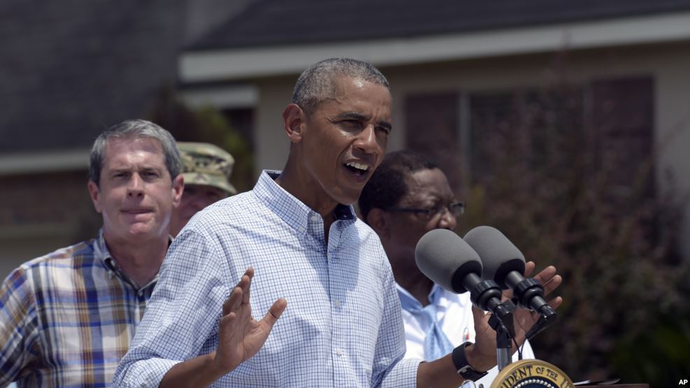 Ông Obama đi thăm thành phố Baton Rouge hôm 23/8 và đã đến thăm các khu vực nhà cửa bị hư hại trong trận lũ lụt lớn kỷ lục hồi đầu tháng Tám. Ông nói chính phủ liên bang đến nay đã chu cấp 127 triệu đôla hỗ trợ cho 100.000 người nộp đơn xin trợ cấp.