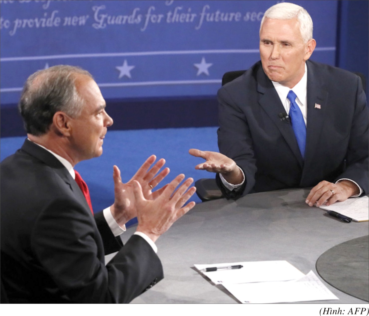 Tối thứ Ba 4/10, hai ứng viên Phó tổng thống Hoa Kỳ Mike Pence (Cộng Hòa) và Tim Kaine (Dân Chủ) đối đầu nhau trong cuộc tranh luận duy nhất trước cuộc bầu cử vào tháng tới. Trong lúc tìm cách tấn công ứng viên Tổng thống của đối thủ, cả hai ông Pence và Kaine thường xuyên cắt lời nhau trong khi thảo luận về vấn đề vũ khí hạch nhân, tình hình Syria và vấn đề tội phạm và cải cách hệ thống tư pháp ở trong nước.