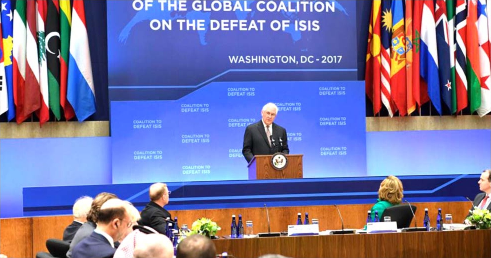 Cuộc họp được chủ trì bởi Ngoại Trưởng Hoa Kỳ Rex Tillerson. Tổng thống Trump thề sẽ đặt cuộc chiến chống Nhà Nước Hồi Giáo lên ưu tiên hàng đầu và hồi tháng Giêng đã chỉ đạo Ngũ Giác Đài cùng các cơ quan khác đệ trình kế hoạch đánh bại IS.