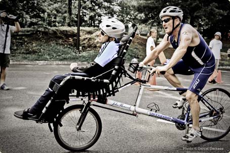 Khi dự thi ba bộ môn thể thao phối hợp triathlon, Dick bơi với giây cột quanh eo để kéo Rick nằm trên một xuồng phao. Qua phần đua xe đạp, Rick ngồi phiá trước một chiếc xe đạp dọc được thiết kế đặc biệt. Đối với phần chạy bộ, Dick đẩy Rick ngồi trên xe lăn.