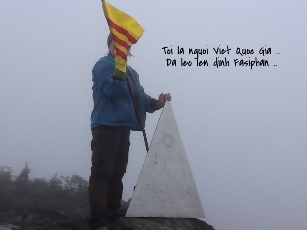 Tôi đã dương cao được lá cờ trên đỉnh Fansipan. Lá cờ vàng ngày xưa hai bà Trưng Trắc, Trưng Nhị cũng đã dương cao khi đi đánh quân tàu. Lá cờ đầy ý nghĩa màu vàng tượng trưng cho da vàng Đất Việt, ba sọc cho ba miền Nam, Trung, Bắc. Tôi yêu lá cờ quốc gia đó. Tôi mong một ngày chính thể có thể thay đổi và người Việt Nam ở Việt Nam sẽ hiểu ra rằng lá cờ đỏ sao vàng cờ chỉ là lá cờ theo Trung Quốc mà thôi ... nó chẳng mang một ý nghĩa nào cả. Có lẽ điều đó còn rất lâu mới làm được nếu thi thể ông Hồ còn nằm đó trong bảo tang trong lòng Hà Nội mà điều đau buồn là quân tàu đã tàn phá đất nước Việt Nam, tại sao chúng ta vẫn cứ bám gót họ khi cả khối Đông Âu cộng sản đã tan rã ở Nga. Tượng hình Lenin, K Marx đã kéo sập đổ. Bức tường Balinh cũng đã ngã… Vậy mà lòng người cộng sản Việt Nam không thay đổi được