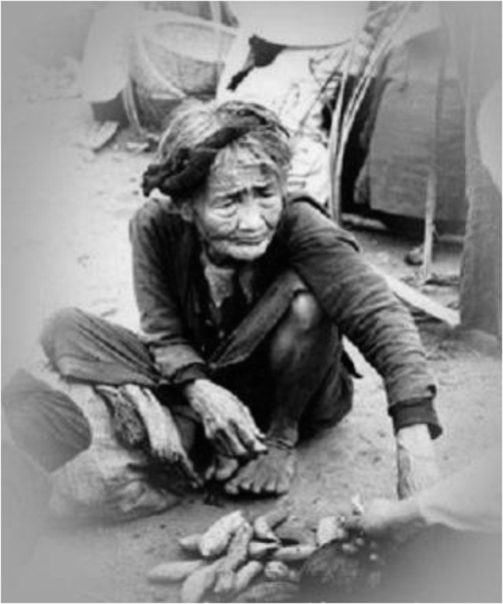 Mùa Đông tháng giá, tiết trời khá lạnh ở vùng quê với căn nhà lá có nhiều khe hở để gió lùa vào, anh em tôi nằm ổ rơm, đắp chiếu, kín đầu thì hở đuôi và ngược lại kín chân thì thò đầu, cái lạnh đêm khuya lại thêm dạ dày trống đúng với câu châm ngôn “bụng đói cật rét” nên giấc ngủ chập chờn. Nửa đêm về sáng, khi gà vửa gáy, tôi thức giấc thấy ánh lửa từ nhà bếp hắt lên, tôi bò dậy và mon men tới để sưởi cho ấm thì thấy bu tôi ngồi nấu cám heo, một tay cầm que, tay kia nắm mớ rơm đẩy vào tiếp cho lửa cháy, bóng mẹ tôi in lên vách bếp, ngả nghiêng theo ánh lửa bập bùng. Đêm khuya, thấy con thức dậy bò xuống bếp thì bà mẹ biết con đang thiếu cái gì. Vừa trông thấy tôi, bà vội kéo vạt áo lau nước mắt, rồi nói: