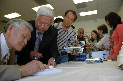 Nhà báo Sơn Điền Nguyễn Viết Khánh ký sách “Những Mùa Xuân Trở Lại” cho độc giả tại phòng sinh hoạt Nhật Báo Người Việt, ngày 8 Tháng Bảy, 2007. (Hình: Đỗ Dzũng/Người Việt)