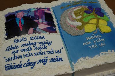 Chiếc bánh cake do đài phát thanh Radio Bolsa tặng nhà báo Sơn Điền Nguyễn Viết Khánh nhân dịp ra mắt sách "Những Mùa Xuân Trở Lại" (Hình Đỗ Dzũng/Người Việt)